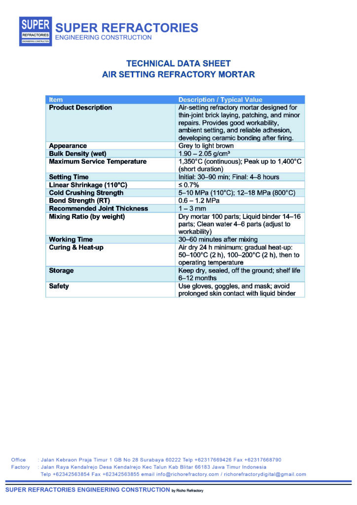 Air Setting Refractory Mortar adalah material perekat tahan panas yang diformulasikan khusus untuk pemasangan bata tahan api (fire brick) pada aplikasi refractory. Mortar ini memiliki kemampuan setting pada suhu ruang (air setting) sehingga mempermudah proses instalasi tanpa memerlukan pemanasan awal.