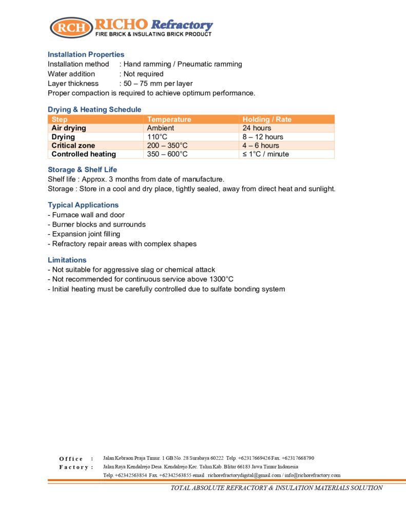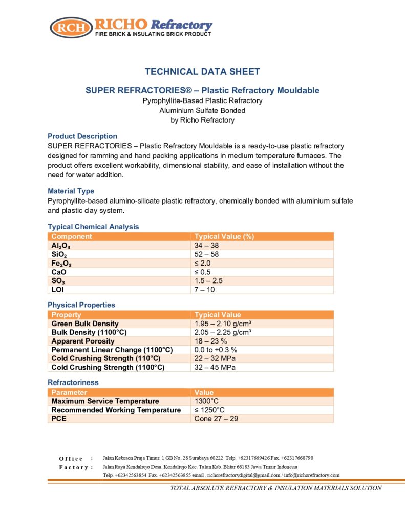 Mouldable atau Plastic Refractory adalah material tahan panas berbentuk plastis yang dapat langsung dibentuk tanpa penambahan air. Cocok untuk pekerjaan perbaikan dan area yang membutuhkan pembentukan manual.